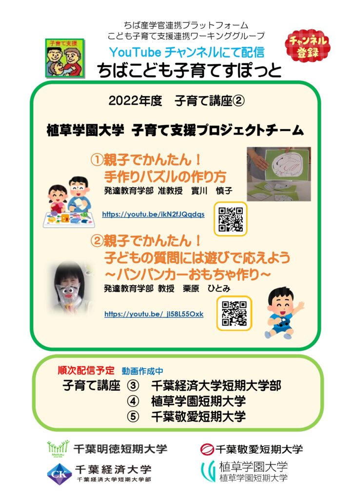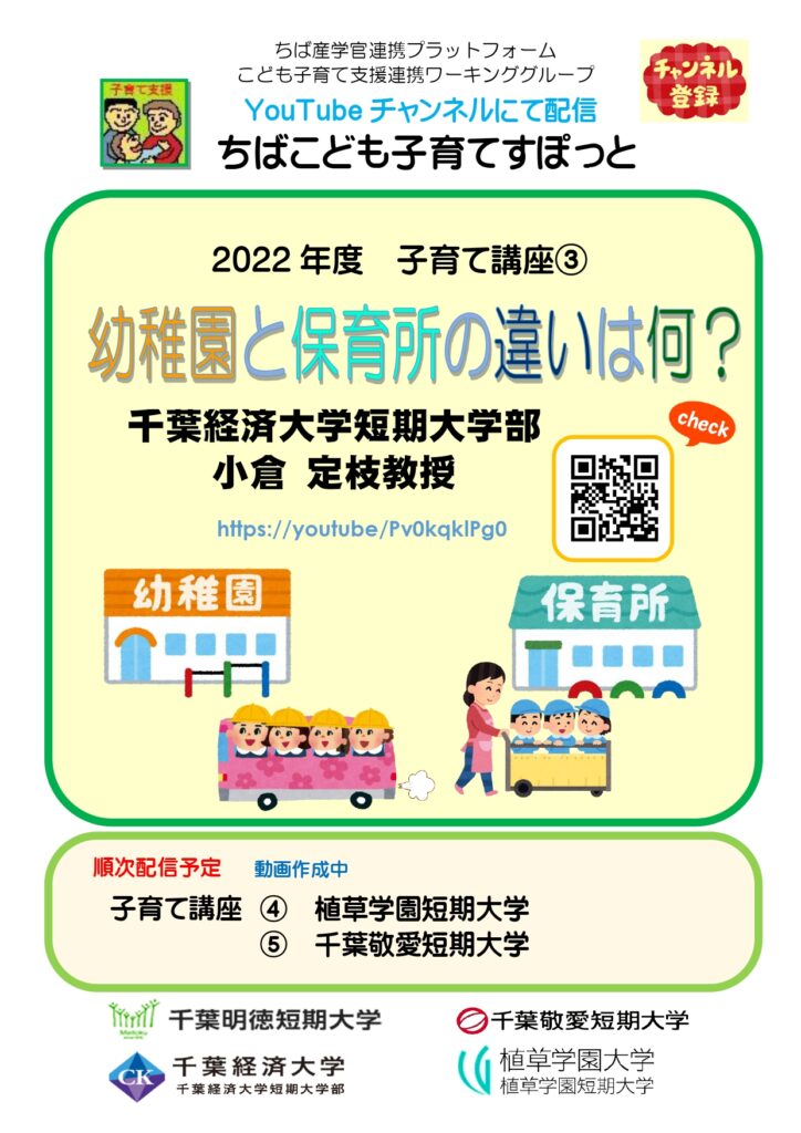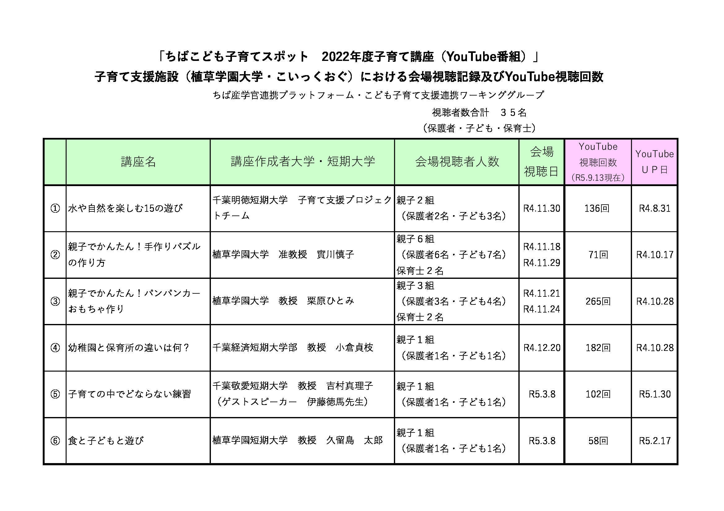 「ちばこども子育てすぽっと」2022年度のご案内 「ちばこども子育てスポット 2022年度子育て講座(YouTube番組)」 子育て支援施設(植草学園大学・こいっくおぐ)における会場視聴記録及びYouTube視聴回数