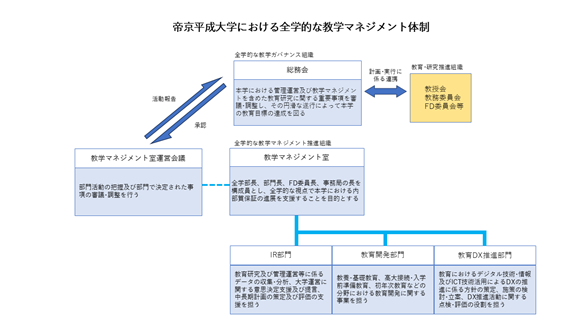 本学では、「2040年に向けた高等教育のグランドデザイン(答申)」および「教学マネジメント指針」を踏まえ、全学的な教学マネジメント体制(下図)を構築している。